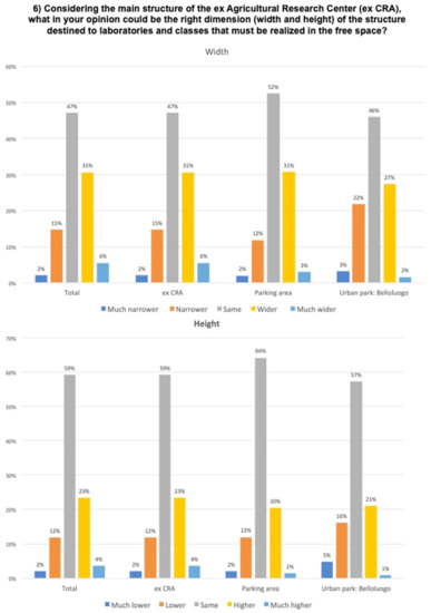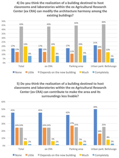 From the analysis of the questionnaire, it emerged that the preservation of cultural-historical aspects should not be interpreted as prejudicial to urban transformation. What is important is to create harmony between the new urban elements that will be developed and the cultural–historical value of the area. In this perspective, according to the surveyed respondents, a new building within the former CRA should be designed as a multi-purpose center, without compromising the urban identity in which university activities, but also other social activities, can be developed, e.g., libraries, playrooms, and leisure centers.