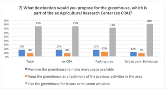 Through participation, it was also possible to collect suggestions and specific proposals to plan the use and design of the urban space. In the initially proposed PUUC, the elimination of the greenhouse that is currently in a state of neglect was planned so as to make room for the new building. The surveyed respondents expressed their willingness to preserve the greenhouse and use it for recreational activities (Figure 11). An interesting aspect is that many surveyed respondents were unaware of the presence of the greenhouse. Even many students who attend the area have not noticed its presence or thought that the structure was indeed a greenhouse. This probably shows how limiting the use of this area can also compromise the awareness regarding the place and its identity. Therefore, creating a green area without increasing the usability of the place or the ability of people to move within it can limit the cultural value of the area.