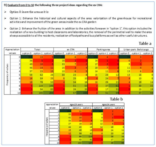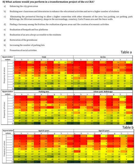 The numbers in the cells represent the frequencies relative to the appreciation value for each proposed alternative. The answers were analyzed, considering both the single survey areas and the whole (Figure 9a). In Figure 9b, the answers were analyzed considering two age groups: under 25 years and over 25 years.