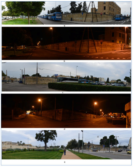 To make this area more active from a social point of view, it is fundamental to ensure greater use of the spaces and movement of individuals within the area. The possibility of an individual to perceive an area of social value and obtain benefits depends on the experience that an individual has in moving within the space, creating occasions for social interactions and enjoyable time [16,18]. The imposing enclosure wall (h = 2.50 m) that surrounds the entire area of the CRA is an obstacle, isolating this urban space from the surrounding area (Figure 12).
