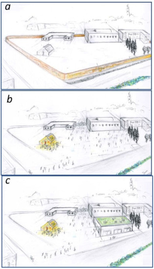 (a) schematic representation of the actual state of the area; (b and c) draft of the potential evolution of the area following and interpreting the indications of the respondents and discussion with the citizens, designers, and decision-makers. This figure represents a simple scientific exercise and does not have legal or institutional value or what this area will be in the future.