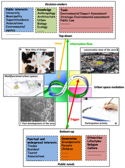 The study shows that in the socio-ecological system, the bottom institutional levels can introduce innovation or new vision in the use of free urban space and, therefore, bottom-up participation can push or trigger the evolution of the urban ecosystem, while the top institutional level drives the change from the top-down using the bottom-up participation information in planning actions between decision-makers. Therefore, considering the adaptive cycle in social–ecological systems, the bottom-up activity can be considered as a “revolt” process that affects the “urban space”, changing it from a “conservation (K)” phase, where the urban space can be kept in a state of no-social use contributing in the degradation of identities of urban area, into a “collapse or release” (Ω) phase that stimulates new social uses of urban space. Therefore, the bottom-up can support the “reorganization” (α) phase to create situations able to drive innovation, considering economic and social processes. Top-down, in this case, plays a crucial role in determining and designing the new pattern of the urban space. The system will jump into a new adaptive cycle and therefore in new urban use with new environmental, social, and economic characteristics without losing the urban identity (Figure 14).