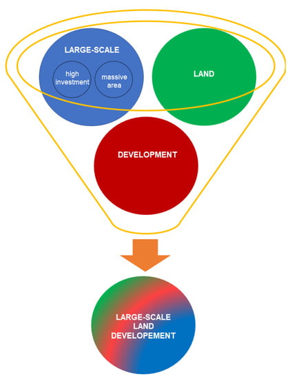 Along with the increase of population growth and urban activities, land development is often carried out in a large-scale form. Some scholars have characterised this development as a massive area of development with more varied land uses [,]. Evidently, this development also requires high investments [], provided either by the public sector or private developer [,]. A depiction of large-scale land development is illustrated in Figure 1. Although these developments are also discovered in urban areas, they appear to be more prominently developed in peri-urban areas, also known as peri-urbanisation [,]. The main reason for this emerging phenomenon is the broader availability of land in urban outskirts at lower prices [].