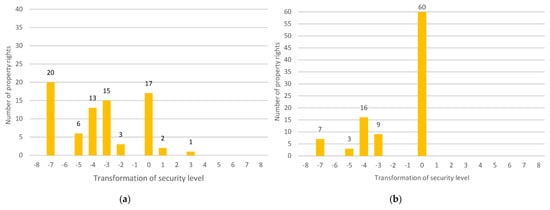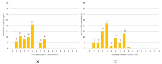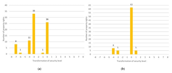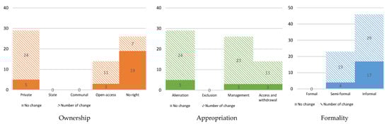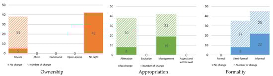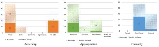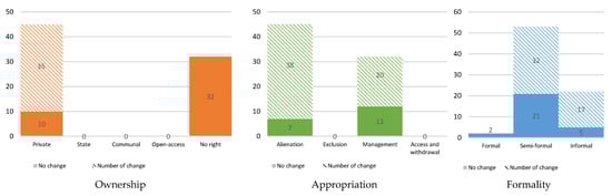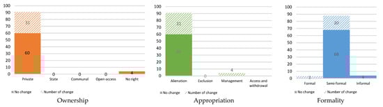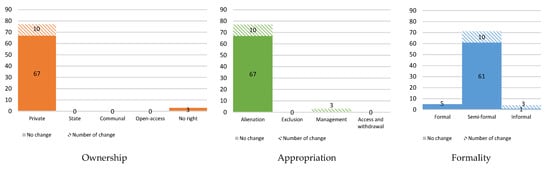 - Classification of the changes in security levels of combined rights (ownership, appropriation, and formality). The change of security level shows the magnitude of changes in the security level of property rights. Besides the magnitude, the change also considers the direction of the transformation, i.e., increased (more than 0), no change (0), or decreased (less than 0) (Figure 4).