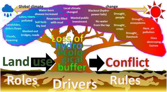 The nexus of forest–water–people interactions is central to the landscape as social-ecological system; it is not restricted to institutional forest definitions, but relates to actual tree cover of different quantity, quality, age and spatial pattern [7]. Many authors have noted that current drivers and pressures lead to partial-interest decisions, suboptimal and often contested consequences, including disturbances of hydrological cycle and flow regimes [8,9]. Diagnosing the issue, from plot-level soil effects to continental hydro-climates [10], is a relevant first step, but unless it contributes to decisions and actions that correct the system, it remains an academic exercise. Socially, the ecological impacts can increase conflict, aggravating land mismanagement (Figure 1). Rather than trying to redress the symptoms one by one, a more incisive analysis is needed of the social-ecological system as a whole. Change will require a concurrence of local, national and international decisions translated into actions, and as such will be helped by a shared understanding of issues, commitments to achievable goals and action at appropriate temporal (immediate improvement plus long-term results) and spatial scales.