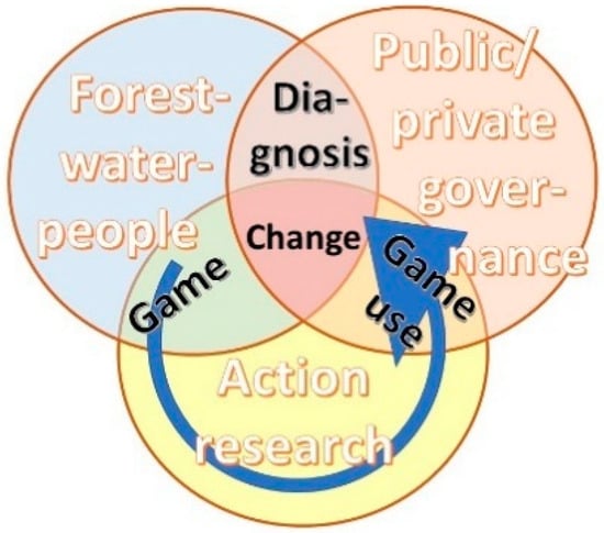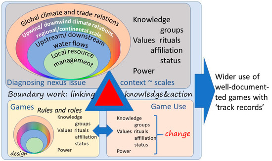 Real-world forest–water–people nexus issues across scale levels, games that reflect these, and game use that can modify the trajectory of real-world issues, where the same game can be used in different settings, in different ways, yielding a track record that can be documented.