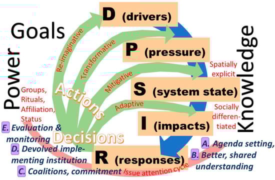 Drivers, pressures, system state, impacts and responses (also known as DPSIR) of landscape level change, with a decision cycle (A–E) closing various feedback loops interacting with knowledge, power and human sociality and its GRASP determinants.