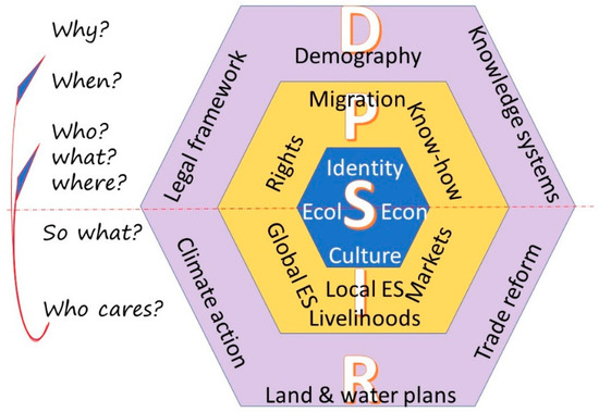 The System-state variables (at the heart of DPSIR) deal with ecosystem structure and function on the (hydro-) ecological side, and with identity, (collective) culture, and economic indicators on the social side (Figure 4, center of the diagram). On the Impacts side, the most relevant indicators can be grouped as livelihoods and local ES, Markets and global ES. Among the pressures, migration (rather than birth rates), rights and know-how, relate to underlying drivers that include legal frameworks, demography and knowledge systems. Responses can include land and water use plans (linked to rights within a legal framework), trade reform and climate action, emphasizing relations between the local system and global change. Part of the latter are attempts to make incentive structures at the land-user level more aligned with ‘downstream’ impacts, via Payments for Ecosystem Services (PES) [34]. The recent PRIME (Productivity, Rights, complementary Investments, Market access and Ecosystem services) framework of the World Bank that has helped conceptualize forests’ contribution to poverty reduction and guide intervention design [35] is compatible with the middle hexagon in Figure 4. Further conceptual framing will be presented after the portfolio of landscapes are briefly introduced.