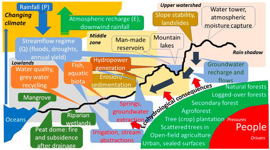 A large number of ‘issues’ in the case studies relate to water and need to be understood in their landscape context (Figure 5). They all relate to the way water flows from mountains ultimately back to oceans, unless it follows the atmospheric ‘short cycle’ downwind route back to rainfall over land. Along the streamflow pathway, water changes in quality (sediment load, pollution), quantity (annual water yield to reservoirs or lakes), and flow regime (regularity of flow, flood risks), affecting settlements, agriculture, fisheries and human health. A major theme is the upstream versus downstream (with the ‘water tower’ configuration of freshwater sources for lowlands specifically challenging), complemented by upwind versus downwind for rainfall recycling, and specific features such as riparian wetlands and forests, peat swamp forests and mangroves protecting the coastal zone, while supporting marine fisheries. The scientific debate on the mechanisms and patterns of ‘biological rainfall infrastructure’ is undecided [6,38]. While the ‘biotic pump’ theory suggests forests cause the flow of moist air towards them, observations of windspeeds show that rainforests are associated with relatively low wind speeds that imply the ‘short cycle’ can remain relatively local, with transport distances during the mean atmospheric residence time of 8 days of hundreds rather than thousands of kilometers [39].