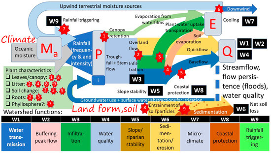 Ecosystem structure (landform, soil, plant characteristics), processes (1–9), and ‘watershed functions‘ (W1–W9) based on water balance: P = precipitation, Q = stream flow, E = evapotranspiration, Ma = atmospheric moisture, i = irrigation.