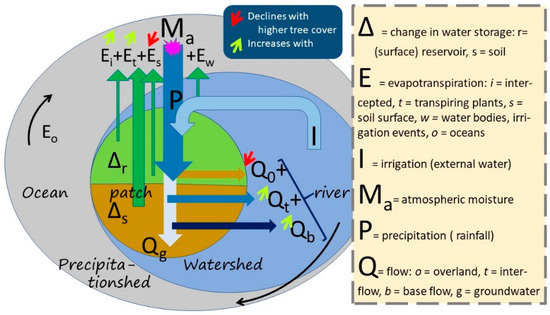 Basic elements of a water balance at patch, watershed and precipitationshed scale levels, that can form a biophysical basis for forest–water–people nexus games, with expected changes in terms with increasing/decreasing forest cover.