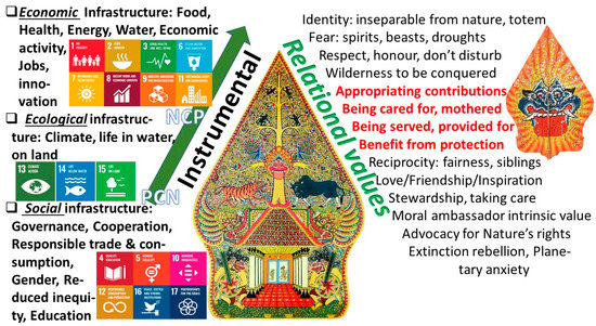 Instrumental as part of relational values of nature from a human perspective as exemplified in the Javanese gunungan representation with its idyllic harmony and fearful disaster side, and the UN Sustainable Development Goals; NCP = Nature’s contributions to people, PCN = People’s contributions to nature.