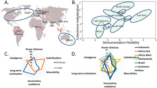 Geography of cultural dimensions: (A) Global map with red signs indicating landscapes where SESAM is active; (B) Two main axes of cultural variation and the relative position of countries (based on national surveys) and country groupings [52]; (C) Comparison of six Hofstede dimensions for two contexts in which the ‘so long sucker’ game was played; (D) Hofstede dimensions for the countries (or where such data are lacking regions) involved in SESAM [53].