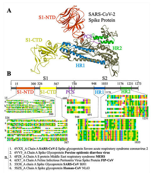 (A) SARS-CoV-2 Spike protein 3D structure with the important domains depicted with colors; S1–N Terminal Domain (orange), S1–C Terminal Domain/ ACE2 Binding Domain (yellow), Polybasic Cleavage Site (Purple), S2 Heptad repeat 1 (blue) and S2 heptad repeat 2 (green). (B) SARS-CoV-2 Spike protein 2D representation. Important domains are magnified, and their alignment sequences are shown beneath them. Each alignment box consists of 1 to 3 lanes (a, b, c), whereas the starting amino acid is shown at the top left and the ending amino acid is shown at the bottom right of each alignment box. Each lane consists of 6 sequences subjected to the alignment (n). Conservation exists in higher levels at S2-HR1 and HR2, moderate conservation occurs at S1-NTD and PCS, whereas at S1-CTD there are many hyper-variable regions.