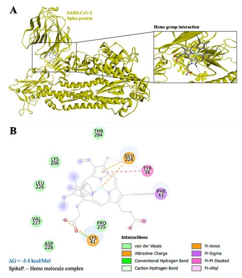 Interestingly, the ARG-237 hydrogen bond persists in both simulations (monomer and tetramer), thus indicating a possible binding area that is more favorable for the interaction in terms of binding efficiency and spatial pairing. Moreover, the region surrounding the above-mentioned amino acid might facilitate the binding of the heme group to the S1-NTD region of the Spike protein. Simulation of this interaction yielded a binding energy score of −5.4 kcal/Mol. The results of the interaction show several Van der Waals bonds surrounding the heme group, whereas there are six Pi-(Anion, Sigma, -Pi Stacked and Alkyl) bonds and one hydrogen bond bridging with the Spike protein (Figure 4A). Amino acid residues TYR-38, LYS-41, PHE-43, LYS-206, GLU-224, PRO-225, LEU-226, VAL-227, ASP-228, and THR-284 of Spike protein interact with the heme group directly. The core amino acid of this interaction is GLU-224, which might possess the ability to directly bind the heme iron with a Pi-Anion bond, thus preventing free oxygen-binding in this area (Figure 4B).
