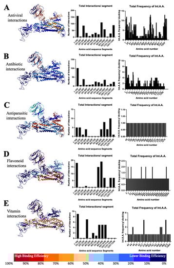 Furthermore, in the case of antiparasitic drugs, we found that the residues of S2 Spike between 901–1000 and 1101–1200 aa are very important, especially the locations LYS-1205 and TYR-1209, which are similar to antivirals and antibiotics (Figure 5C). However, we also found interaction at S1-NTD between the residues 1–101 and 200 aa, which suggests the therapeutic importance related to S1 Spike protein. Additionally, a study with flavonoids revealed that interactions mainly happen at S1-NTD between the residues 1–100, especially at the locations VAL-6 and ARG-21, and at S2 between the residues 701–900, such as LYS-790, LYS-811, ALA-893 and LEU-1224 (Figure 5D). Similarly, the interaction with vitamins C and D lies between the residues 1–100, 301–400, and 501–600 amino acids of Spike S1, most importantly VAL-47, PHE-318, and THR-630, and between the 701–1000 residues of Spike S2, especially the residues TYR-741, ILE-742, CYS-743, and GLY-744 (Figure 5E; Table S3).