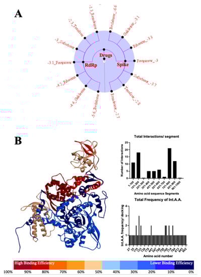 A graphical representation of the comparative analysis found in Table S4. Binding energies are organized here (A) and are arranged from weakest to strongest based on the molecule they are interacting with. These lists of drugs and their binding energies are separated along the central axis based on the viral protein they are interacting with, namely RdRp on the left and the Spike protein on the right-hand side. Additionally, quantitative analysis and graphical representation of the locations at which the molecules are interacting with the SARS-CoV-2 RdRp (B) can be observed.