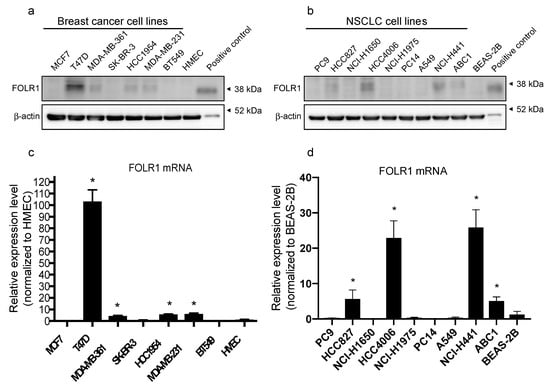 Folate receptor α (FOLR1) expression in breast cancer and non-small cell lung cancer (NSCLC) cell lines. (a,b) FOLR1 expression was determined by Western blot analysis in the breast cancer cell lines MCF7, T47D, MDA-MB-361, SK-BR-3, HCC1954, MDA-MB231, and BT549 and in the NSCLC cell lines PC-9, HCC827, NCI-H1650, HCC4006, NCI-H1975, PC-14, A549, NCI-H441, and ABC-1. Results were compared with those from normal human mammary epithelial cells (HMECs) and normal bronchial epithelial cells (BEAS-2B), respectively. Blots are representative of three independent experiments. (c,d) The cellular mRNA transcripts were quantified by real-time RT-PCR. Data are presented relative to HMEC values in breast cancer cell lines and BEAS-2B values in NSCLC cell lines, as means ± SEM (n = 8); * p < 0.01.