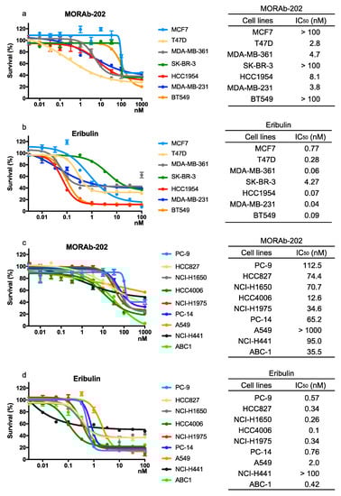 The effect of MORAb-202 and eribulin on proliferation in breast cancer and NSCLC cell lines. Cells were treated with MORAb-202 (a,c) or eribulin (b,d) at the indicated concentrations for 96 h. Cell proliferation assays were performed, OD 570 values were measured after 96 h of incubation, and the cell proliferation curves of MORAb-202 and eribulin treatments in the indicated breast and NSCLC cell lines are shown (left panels). Data represent the means ± SEMs for six wells. IC50 values were determined using GraphPad Prism version 8 and are expressed in the corresponding right panels.