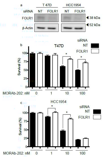 MORAb-202 is an ADC that targets FOLR1. Therefore, the attenuation of FOLR1 should lead to a decrease in the cell proliferation inhibitory effect. T47D and HCC1954 cells express FOLR1 at high levels and are sensitive to MORAb-202 treatment. These cell lines were transfected with siRNA directed against FOLR1; Western blot analysis confirmed that the expression of FOLR1 was attenuated (Figure 3a). The sensitivity to MORAb-202 was reduced in both T47D and HCC1954 cells in which FOLR1 expression was attenuated (Figure 3b,c), indicating that the effect of MORAb-202 is regulated by FOLR1 expression.