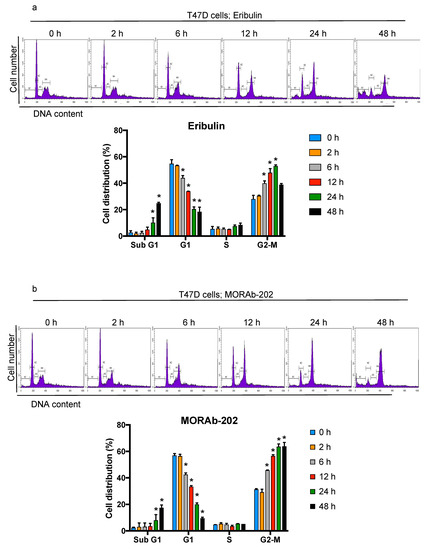 MORAb-202 increases the proportion of cells in the sub-G1 and G2-M phases. (a,b) T47D cells were cultured with eribulin (0.7 nM, which is 2.5-fold the IC50 value of T47D cells) or MORAb-202 (7 nM, which is 2.5-fold the IC50 value of T47D cells) for 0, 2, 6, 12, 24, and 48 h, followed by staining with propidium iodide and analysis of cell cycle distributions via flow cytometry. Histograms show the number of cells (vertical axis) versus the DNA content (horizontal axis) in the upper panels. In the lower panel, the percentages of cell cycle phases were calculated from the histogram. The sub-G1 phase, which indicates the apoptotic cell fraction, is Label M1; the G1, S, and G2-M phases are Labels M2, M3, and M4, respectively. Data are representative of three independent experiments; * p < 0.01 in comparison with data from 0 h.