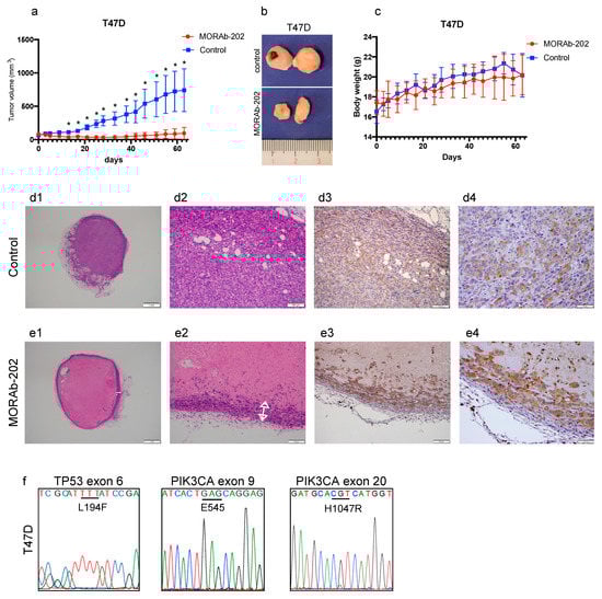 MORAb-202 suppressed orthotopic xenograft tumor growth of T47D cells. (a) T47D cells were orthotopically injected into the bilateral fourth mammary fat pad of NOD/SCID mice. Six mice were randomized into groups and intravenously treated with or without 5 mg/kg of MORAb-202. Tumors were measured twice weekly for 63 days. Data represent mean tumor volumes ± SEMs; * p < 0.01. (b) The representative T47D tumors after 63 days (the upper: the control, the lower: MORAb-202-treated tumor). (c) Body weight changes in non-obese diabetic/severe combined immune deficiency (NOD/SCID) mice over 63 days of treatment with PBS (control) and with MORAb-202 (5 mg/kg). (d1,d2,e1,e2) Seven days after PBS or MORAb-202 administration, the T47D tumor was stained with hematoxylin and eosin. Images were obtained at magnifications of 20× and 100×. The arrow indicates the peripheral tumor layer in e1 and e2. (d3,d4,e3,e4) Seven days after PBS or MORAb-202 administration, FOLR1 was detected in paraffin-embedded T47D-derived tumor tissue by immunostaining at a magnification of 100× and 400×. (f) The sequence read of T47D tumor DNA in exon 6 TP53 and exons 9 and 20 PIK3CA.