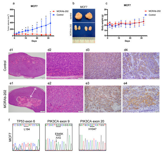 MORAb-202 suppressed orthotopic xenograft tumor growth of MCF7 cells. (a) MCF7 cells were orthotopically injected into the bilateral fourth mammary fat pad of BALB/c-nu/nu nude mice. Six mice per group were randomized into groups and intravenously treated with or without 5 mg/kg of MORAb-202. Tumors were measured twice weekly for 32 days. Data in the figure represent mean tumor volumes ± SEMs; * p < 0.01. (b) The representative MCF7 tumors after 32 days (the upper: the control, the lower: MORAb-202-treated tumor). (c) Body weight changes in BALB/c-nu/nu nude mice over 32 days of treatment with PBS as control and with MORAb-202 5 mg/kg. (d1,d2,e1,e2) Seven days after PBS or MORAb-202 administration, the MCF7 tumor was stained with hematoxylin and eosin. The images were obtained at magnifications of 20× and 100×. The arrow indicates the peripheral tumor layer in e1. (d3,d4,e3,e4) Seven days after PBS or MORAb-202 administration, FOLR1 was detected in paraffin-embedded MCF7-derived tumor tissue by immunostaining at a magnification 100× and 400×. (f) The sequence read of MCF7 tumor DNA in exon 6 TP53 and exons 9 and 20 PIK3CA.