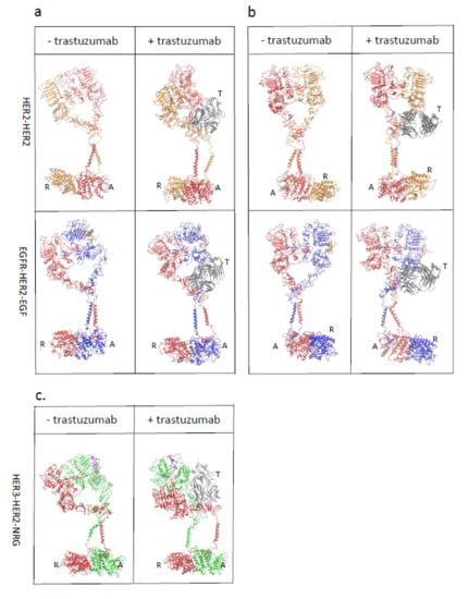 Trastuzumab blocks the receiver function of HER2. The final conformations (after 500 ns simulation) of the HER2-containing homodimers and heterodimers with (right panel) and without (left panel) trastuzumab bound show trastuzumab blocks the receiver function of HER2. HER2 [Receiver (R), gold; Activator (A), red; in the top panels in Figure 1a,b], HER2 (red in the second and third panels in (a–c)), EGFR (blue in the (a,b), second panel), HER3 (green in (c)), EGF (gold in (a,b), the second panel in), heregulin (purple in (c)), light chain and heavy chain of trastuzumab (T; gray). In the HER2-HER2 homodimer, the two monomers are depicted in yellow (receiver) and red (activator), respectively. Trastuzumab binds to either the receiver, R (a) or the activator, A (b) conformation of HER2.