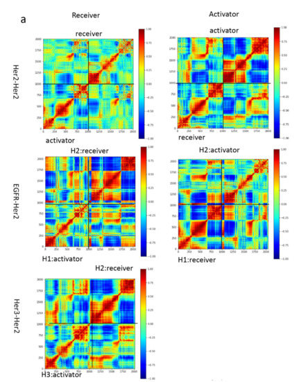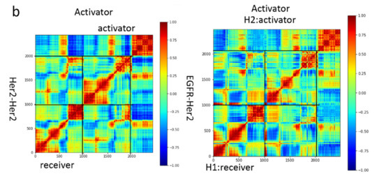 Motion correlation among the residues of the HER2 containing homodimer and heterodimer. Results, (a) without trastuzumab bound and (b) with trastuzumab bound, indicate that trastuzumab changes the dynamic behavior of the tyrosine kinase domain. The conformation of HER2 can be either activator or receiver listed on the top of the columns. Residues with highly (anti)correlated motion are red (blue).