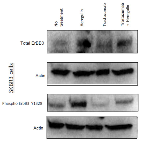 SKBR3 cells were obtained from the American Type Culture Collection (ATCC) and cultured in DMEM media (Lonza) containing 10% fetal bovine serum and 1% antibiotics/antimycotics (Invitrogen). Antibodies directed against total HER3 and phosphorylated HER3 were purchased from Cell Signaling Technologies. Trastuzumab was obtained from FDA-Designated pharmacy and heregulin was purchased from Sigma Aldrich. For Western blot analysis, cells were seeded at 5 × 105 in 6-well plates and treated with trastuzumab, heregulin, trastuzumab + heregulin or left untreated. After treatments, whole cell lysate was collected and subjected to Western blotting to detect the phosphorylated and total levels of HER3.