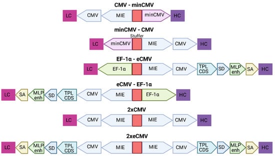 Overview of the different bidirectional combinations tested. The 200-bp stuffer sequence is marked in red for each construct. Abbreviations: minimal CMV (minCMV), cytomegalovirus promoter (CMV), enhanced CMV (eCMV), major immediate early enhancer (MIE), human translation elongation factor 1 alpha (EF-1α), adenoviral tripartite leader sequence (TPL CDS), adenovirus major late promoter enhancer (MLP enh.), splicing donor site (SD), splicing acceptor site (SA), light chain (LC), heavy chain (HC).