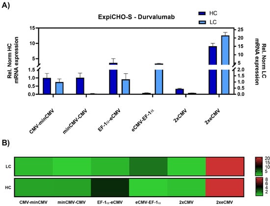 Gene expression analysis of heavy and light chain genes after transient transfection of Durvalumab in ExpiCHO-S cells. (A) Bar chart representing heavy (dark blue) and light (light blue) chain mRNA expression in the different constructs. Values are relative to the CMV-minCMV construct and normalised to housekeeping genes GAPDH and RPLP0. Error bars represent the standard error of the mean of technical triplicates. (B) Heat map representation of gene expression analysis. The relative normalised gene expression for light and heavy chain mRNA is shown on the right with their respective scales.