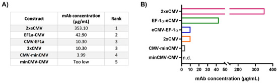 As mRNA transcript levels do not indicate successful secretion of fully functional recombinant antibodies, protein quantification studies were performed. Expi293-F cells were transiently transfected and the amount of secreted therapeutic antibody Durvalumab [27] was quantified by biolayer interferometry (BLI) using sterile-filtered cell culture supernatants six days post-transfection. The mAb concentrations for the different constructs were interpolated from a standard curve generated using an in-house produced mAb. In line with the gene expression analysis, protein quantification resulted in a clear ranking of the different promoter combinations (Figure 5).