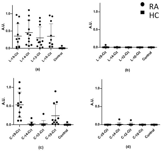 As seen in Figure 2, RA sera recognized all of the linear peptides independent of their length. Sensitivities of approximately 90% were found for all of the linear peptides. In contrast, specific ACPA reactivity was primarily found to the cyclic peptides C-19-Cit and C-10-Cit, obtaining sensitivities of approximately 90% as well. These findings indicate that the peptide conformation affects the antibody reactivity and that it is essential for peptide presentation. Additionally, no specific reactivity was found when screening HC sera. These findings are in accordance with the literature, describing that ACPA reactivity to 19-mer linear and cyclic pro-filaggrin peptides yields similar reactivity, whereas ACPA reactivity to the linear citrullinated peptides is favoured for smaller peptides (<12 amino acids), when compared to the cyclic peptides [23].