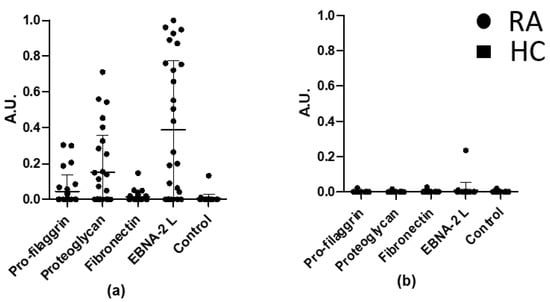 As shown in Figure 3, significant RA antibody reactivity was found to the citrullinated pro-filaggrin (p = 0.0119), proteoglycan (p = 0.0004), fibronectin (p = 0.0459) and EBNA-2 (p < 0.0001) peptides compared to the HC. The proteoglycan and EBNA-2 peptides obtained the highest sensitivities of 50% and 68%, respectively. One HC serum showed low reactivity to EBNA-2 L (Figure 3b).