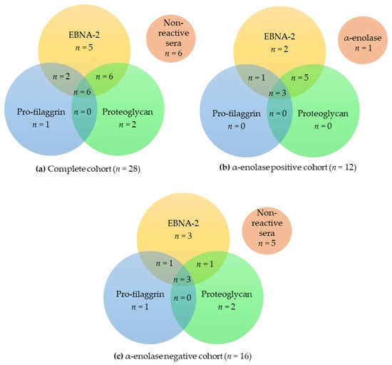 When examining the reactivity of the 3 cohorts (complete cohort, α-enolase-positive cohort, α-enolase-negative cohort) to the three most reactive peptides, pro-filaggrin, proteoglycan, and EBNA-2 L, similar results were obtained. As presented in Figure 4, significant overlapping reactivities were found between the 3 cohorts.
