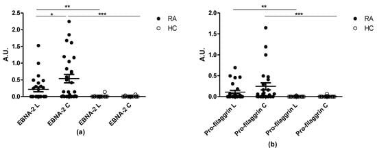 Reactivity of rheumatoid arthritis (RA) samples and healthy control (HC) samples to pro-filaggrin (25 RA and 25 HC samples) and EBNA-2 (28 RA and 28 HC samples) peptides in their linear and cyclic conformation. (a) Reactivity of RA and HC sera to citrullinated cyclic and linear EBNA-2 peptides. (b) Reactivity of RA and HC sera to citrullinated cyclic and linear pro-filaggrin peptides. A.U. were defined as absorbances normalized relative to a positive RA control pool. *** p < 0.001, ** p < 0.01, * p < 0.05.