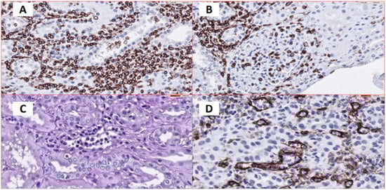 There are three types of rejection in kidney transplants: T-cell-mediated rejection TCMR, ABMR, and mixed rejection [,]. TCMR begins with the presentation of the donor alloantigen’s to the recipient’s T cells, inducing their activation, proliferation and subsequent migration to the graft where they secrete cytokines that induce damage and injury in the transplanted organ []. ABMR is produced by the recognition of the donor’s HLA or non-HLA molecules; and mixed rejection, as the name implies, is the combination of cell-mediated and antibody-mediated rejection. The rejection can also be classified by the time it is presented as hyperacute (within 48 h after transplantation), acute (within the first 6 months after transplantation) or chronic (a slow and progressive reduction in kidney function, that persist for years) [,,].