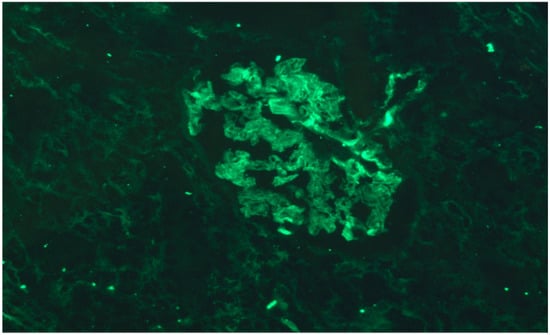The results of the renal graft biopsy showed the presence of lymphocytic infiltrate, as well as the presence of C4d deposits in the glomeruli but absence of C4d in the peritubular capillaries (Figure 4 and Figure 5).
