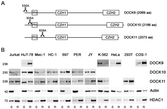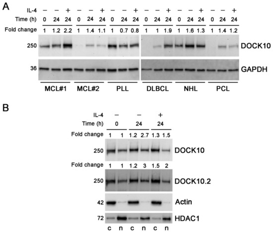 In the present study, our first goal was to investigate whether the nuclear localization of DOCK-D proteins is a rare or common occurrence. For this purpose, we fractionated cytosolic and nuclear protein extracts from cell lines and analyzed the expression of DOCK9, DOCK10, and DOCK11. The distribution varied for each cell line, having in some cases similar levels in both compartments and in others a preference for one or another location, with the nuclear location, in conclusion, being quite common. Second, we set out to investigate whether IL-4 induces DOCK10 in other B-cell neoplasms than CLL, and to analyze the cytoplasmic and nuclear distribution in another CLL patient using appropriate indicators of the purity of the cytosolic and nuclear fractions. We found that IL-4 induces the expression of DOCK10 in lymphoid neoplasms such as mantle cell lymphoma and DLBCL, and we confirmed that IL-4 induces cytoplasmic levels of DOCK10 in CLL. Finally, we provide evidence of the first useful DOCK10 antiserum for IF microscopy, which labelled PM ruffles and filopodia in HeLa cells transfected with DOCK10.