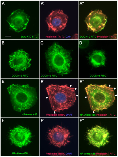 Localization of DOCK10 in PM ruffles and filopodia in transfected HeLa cells using a DOCK10 antiserum. IF microscopy analysis of a HeLa clone with inducible expression of HA-DOCK10, washed free of dox, reseeded without dox on poly-L-lysine coating, and cultured for 24 h. Cells were labelled with rabbit anti-DOCK10 antiserum (micrograph series A and micrographs B–D) or rat anti-HA Ab (micrograph series E,F), followed by FITC-conjugated swine anti-rabbit Igs (green) or Alexa Fluor 488-conjugated goat anti-rat Igs (green), respectively, phalloidin-TRITC (red), and DAPI (blue). (A–F) Labelling with FITC- or Alexa Fluor 488-conjugated Igs (A’,E’,F’). Merge of phalloidin-TRITC and DAPI labelling. (A”,E”,F”). Merge of labelling with FITC- or Alexa Fluor 488-conjugated Igs and phalloidin-TRITC. Micrograph series (A,E), and micrographs (B,C), illustrate the extensive presence of DOCK10 in the membrane ruffles. Arrowheads in (E’,E”) indicate peripheral stress fibers. Micrograph (D) and micrograph series (F) illustrate that in filopodia-rich cells, DOCK10 locates to filopodia. Objective magnification: 60×. Scale bar: 10 µm.