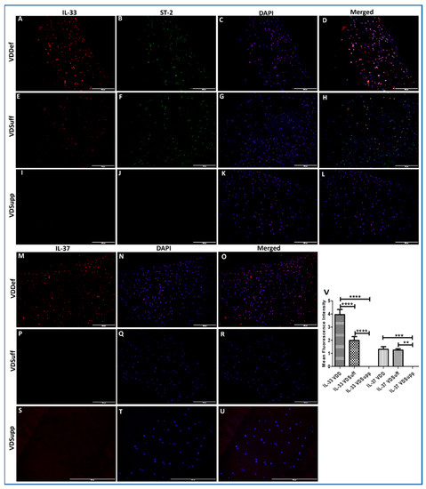 Immunofluorescence for IL-33 and IL-37 in VDDef, VDSuff, and VDSupp microswine cartilage. IL-33 (panels A,E,I), ST2 (panels B,F,J), IL-37 (panels M,P,S), DAPI (panels C,G,K,N,Q,T), merged images (panels D,H,L,O,R,U), and mean fluorescence intensity of IL-33 and IL-37 (panel V). These are the representative images from all subjects in the study. Results are presented as mean ± SD (n = 3). ** p < 0.01, *** p < 0.001 and **** p < 0.0001. DAPI—2–4-diamidinophenyl-1H-indole-6-carboxamidine, IL—interleukin, VDDef (vitamin D deficient), VDSuff (vitamin D sufficient), and VDSupp (vitamin D supplemented).