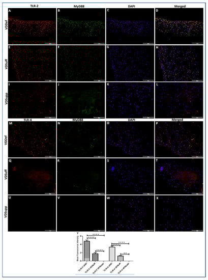 Immunofluorescence for TLR-2 and TLR-4 in VDDef, VDSuff, and VDSupp microswine cartilage. TLR-2 (panels A,E, and I), TLR-4 (panels M,P, and S), MyD88 (panels B,F,J,N,R, and V), DAPI (panels C,G,K,O,S, and W), merged images (panels D,H,L,P,T, and X), and mean fluorescence intensity of TLR-2 and TLR-4 (panel Y). These are the representative images from all the subjects in the study. Results are presented as mean ± SD (n = 3). ** p < 0.01, **** p < 0.0001. DAPI—2–4-diamidinophenyl-1H-indole-6-carboxamidine, MyD88—myeloid differentiation primary response gene 88, TLR—toll-like receptor.