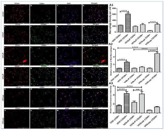 Immunofluorescence for M1 and M2 macrophages in VDDef, VDSuff, and VDSupp hyperlipidemic microswine. CD14+ cells (macrophages; panels A,E,I,M,Q, and U), CD86+ cells (M1 macrophages; panels B,J, and R), CD206+ cells (M2a macrophages; panels F,N, and V), DAPI (panels C,G,K,O,S, and W), merged images (panels D,H,L,P,T, and X), macrophage density (panel A1), the relative change in macrophage density with vitamin D status (panel A2), and mean fluorescence intensity of M1 and M2 macrophages (panel A3). These are the representative images of all the subjects in the study. Results are presented as mean ± SD (n = 3). ** p < 0.01, **** p < 0.0001. DAPI—2–4-di-amidinophenyl-1H-indole-6-carboxamidine.