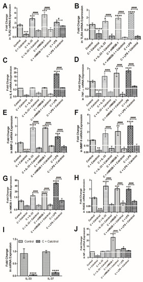 The qRT-PCR analysis of cDNA synthesized from untreated and NHAC treated with calcitriol (50 nM), rIL-33 (25 ng/mL), rHMGB-1 (500 ng/mL), and LPS (100 ng/mL) revealed that calcitriol significantly downregulates the stimulatory effect of rIL-33, rHMGB-1, and LPS on the mRNA expressions of TLR-2, TLR-4, TNF-α, MMP-2, MMP-9, RAGE, and HMGB-1 (Figure 4). These findings suggest that calcitriol not only attenuates the mRNA expression of mediators of inflammation but also attenuates the effect of IL-33, HMGB-1, and LPS on the mediators of inflammation.