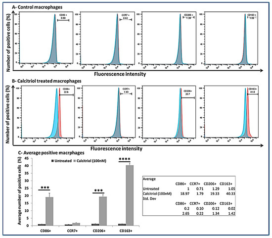 Flow cytometry analysis for the effect of calcitriol on PMA-treated THP-1 cells. (A) From left to right CD86+ cells, CCR7+ cells, CD206+ cells, andCD163+ cells in control macrophages, (B) From left to right CD86+ cells, CCR7+ cells, CD206+ cells, andCD163+ cells in calcitriol treated macrophages, (C) number of CD86, CCR7, CD206, CD163 positive cells (%). *** p < 0.001 and **** p < 0.0001. Blue color—isotype and red color—antigen-treated cells. CD—cluster differentiation, CCR—CC motif chemokine receptor.