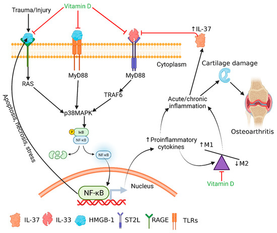 Schematics predicting the IL-33-mediated inflammation and the therapeutic targets of calcitriol. HMGB-1 is secreted after the initial damage to the cartilage, which also increases secretion of IL-33. Downstream signaling of HMGB-1 through RAGE and TLRs and of IL-33 through NF-kB leads to the increased secretion of pro-inflammatory cytokines, resulting in acute inflammation. Persistent secretion of the inflammatory cytokines such as IL-33 may result in chronic inflammation in the cartilage and continued cartilage damage, leading to severe OA. Vitamin D attenuates the downstream signaling of HMGB-1 and IL-33 and suppresses the secretion of inflammatory cytokines. Vitamin D also favors M2 macrophage polarization, having an anti-inflammatory action. Thus, vitamin D might be used to target IL-33- and HMGB-1-mediated inflammation in osteoarthritis.