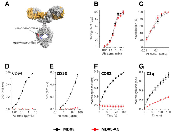 Binding characteristics of the MD65 antibody engineered versions. (A) Schematic representation of the mutations inserted into the YTE version (Red) and the AG version (Red and Blue). (B) Binding to immobilized SARS-CoV-2 spike protein, tested by ELISA. (C) in-vitro neutralization of SARS-CoV-2 using plaque reduction neutralization test (PRNT). (D,E) Binding to immobilized CD64 (D) or CD16 (E), evaluated by ELISA. (F) BLI measurements of the binding of each antibody to immobilized CD32. (G) BLI measurements of the binding of C1q to the immobilized antibodies. Values are average ± SEM of triplicates of a representative experiment (B–E) or of three independent experiments (F,G).