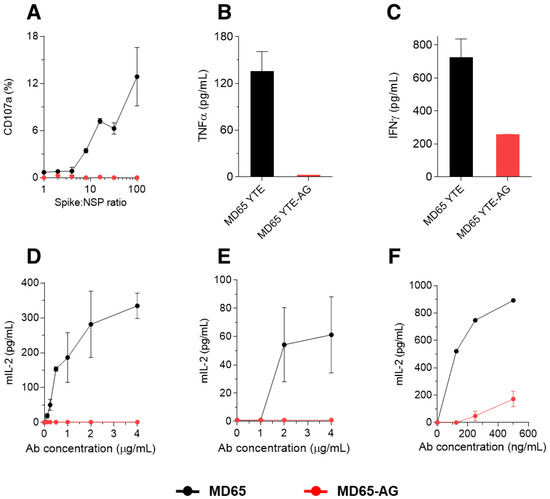 It has been previously established that a major aspect of the monoclonal antibody therapeutic effect, is based on NK cell mediated antibody-dependent cellular cytotoxicity (ADCC) [7]. Therefore, we have conducted a series of ex vivo functional assays to assess ADCC induced by both MD65 and MD65-AG using enriched primary NK cells (pNK). A model system was tailored to specifically inspect the mAb-pNK cell activation axis (expression of CD107a and secretion of IFNγ and TNFα) [46]. In order to induce Ag-mAb complex formation, tested mAbs were incubated with a reciprocal concentration gradient of SARS-CoV-2 spike and inert control protein of similar molecular weight, keeping the total protein concentration constant. The membrane-associated CD107a staining assay indicates the extent of the pNK cells’ activation and degranulation. As expected, only incubation of pNK cells with spike complexed with MD65 induced elevated cell surface expression of CD107a (Figure 2A). Accordingly, pNK cells secreted significantly less IFNγ and TNFα when incubated with MD65-AG complexed with spike as compared to incubation with MD65-spike complex (Figure 2B,C).