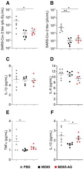 Next, mice were intranasally (IN) infected with SARS-CoV-2 and concomitantly administered with 1 mg of either MD65 or MD65-AG, intraperitoneally (IP). The clinical effect of the treatment of the two MD65 versions was then evaluated by measuring lung SARS-CoV-2 viral loads in infected mice six days post-infection (the latest time point before mortality onset [4]). We employed qRT-PCR for the quantification of viral burden. In the control non-treated group, as expected, the virus propagated and reached very high concentrations (Figure 3A). In contrast, treatment with either MD65 or AG resulted in significantly lower pulmonary viral loads by more than an order of magnitude compared to the untreated group (Figure 3A). Further evaluation of the infectivity of the virus in these samples (by measuring its ability to infect VERO E6 cells), confirmed the qRT-PCR results and showed that treatment of infected mice with MD65 (either version) significantly inhibited (~100-fold decrease) the ability of the virus to propagate with no apparent difference in effect between the antibody version used (Figure 3B).